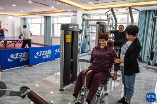5月12日,北汝村居民在小区健身中心锻炼。