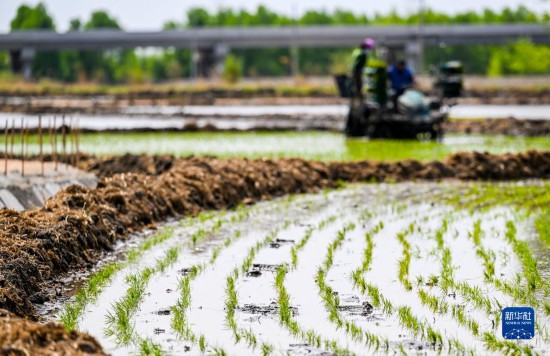 5月15日,农民驾驶插秧机在兴安盟乌兰浩特市的水稻田中插秧。