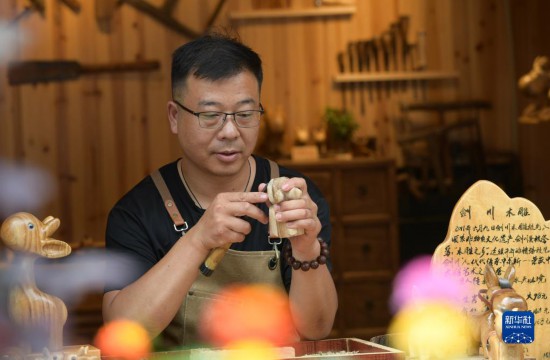 6月17日,一名手工艺人在贵州省镇远古城一家木雕店雕刻工艺品。