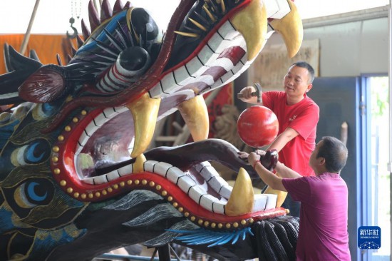 6月17日,艺人在镇远古城龙舟文化传承基地制作龙头。