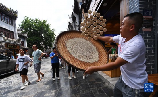 6月17日,一名商贩在镇远古城加工苗家蝴蝶饼。