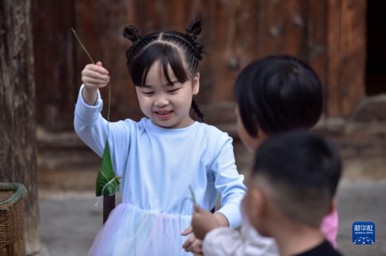 6月16日,小朋友在镇远古城 阳河畔体验包粽子。