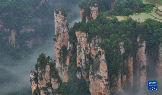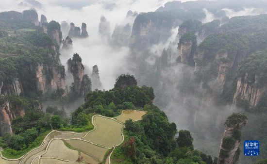 近日,湖南张家界迎来连续降雨。雨后,云雾在连绵耸立的峰林间飘荡,悬崖峭壁之上的农田在云雾中若隐若现,构成一幅幅独特的生态画卷。