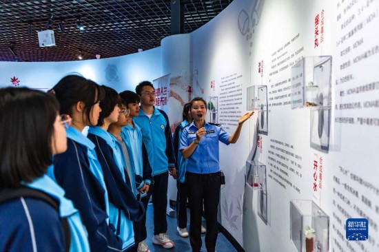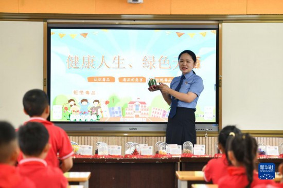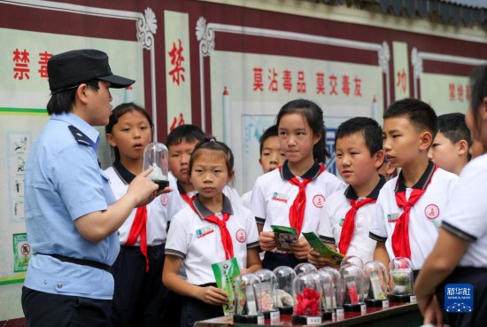 6月25日,民警在贵州省安顺市禁毒宣传教育基地为学生讲解毒品相关知识。