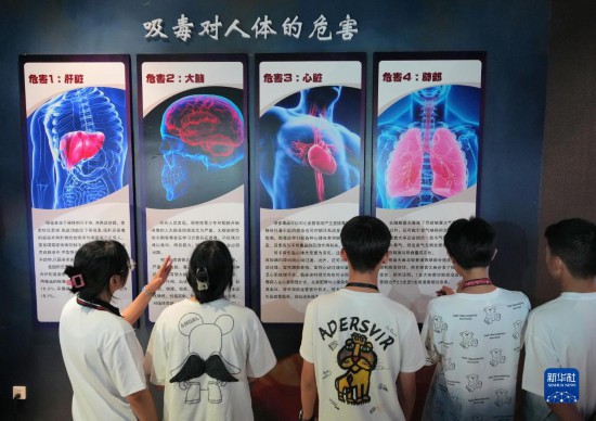 6月25日,高中生在山东省烟台市牟平区禁毒教育基地了解吸毒对人体的危害。