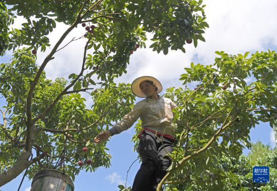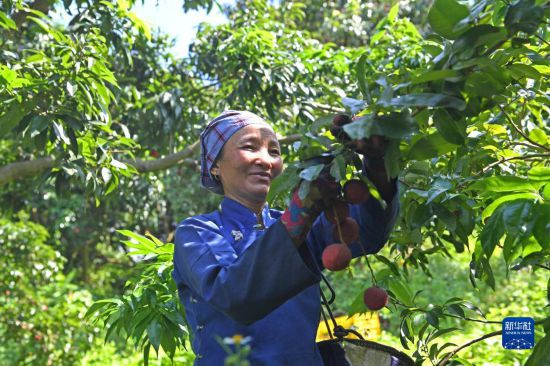 6月27日,广西北流市北流镇六行村村民在采摘荔枝。