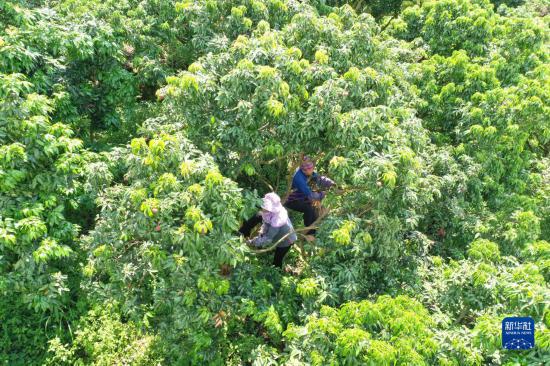 6月27日,广西北流市北流镇六行村村民在采摘荔枝(无人机照片)。