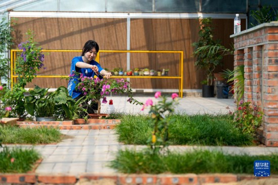 7月3日,河北省唐山市路北区一处家庭农场的工作人员在打理种植的花卉。