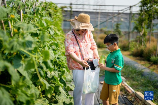 7月3日,家长带着孩子在河北省唐山市路北区一处家庭农场内采摘。