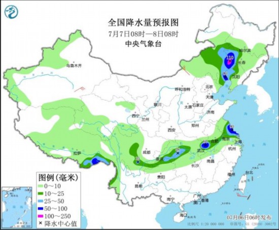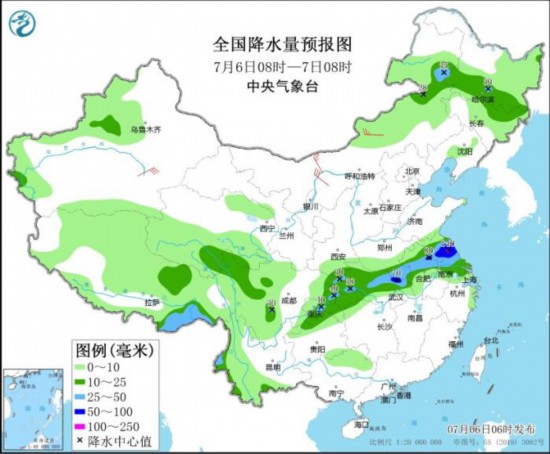 全国降水量预报图(7月6日08时-7日08时)。图片来源:中央气象台网站