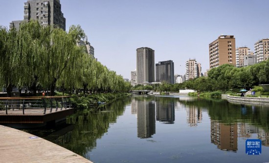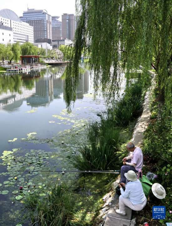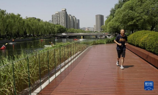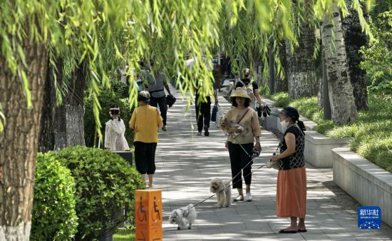 7月5日,市民在环境优美的亮马河畔休闲散步。