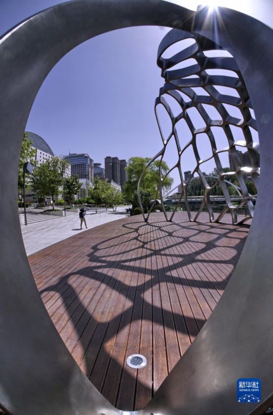 亮马河燕莎桥附近河岸公园的现代雕塑(7月5日摄)。