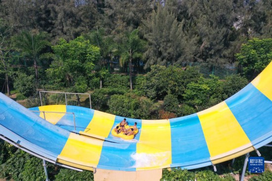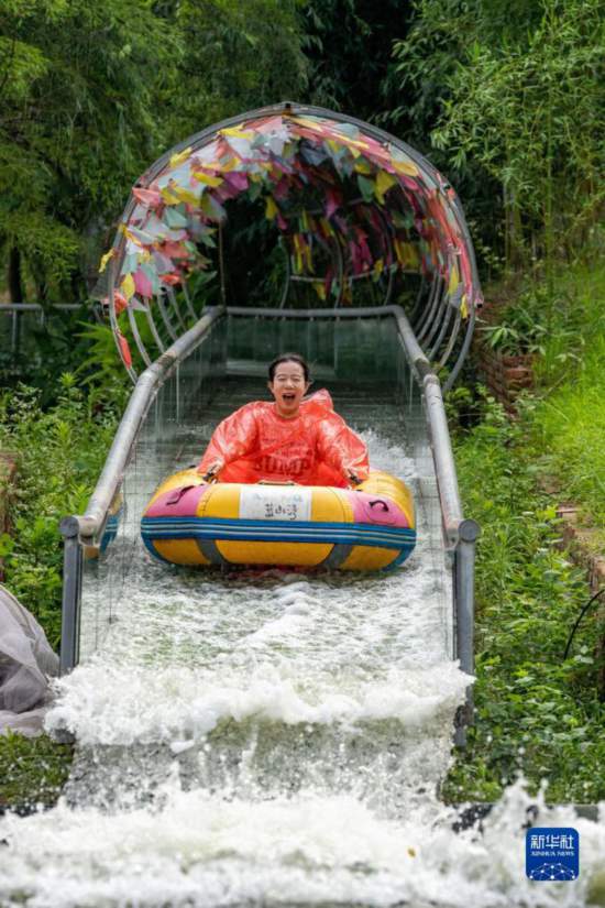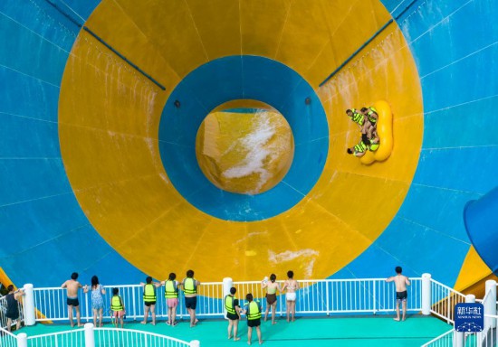 7月8日,游客在安徽省芜湖市南陵县大浦乡村世界的水上乐园戏水游玩。