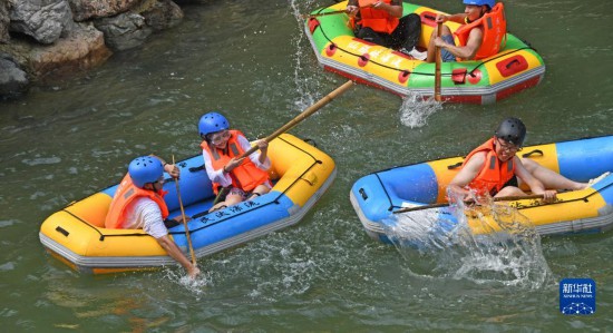 7月9日,游客在浙江省台州市仙居县仙腾峡漂流戏水。