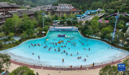 7月8日,小朋友在贵州省镇远县羊坪镇一家水上游乐园戏水游玩。