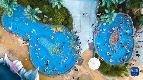 7月8日,游人在湖北省襄阳市华侨城奇梦海滩水乐园游玩(无人机照片)。