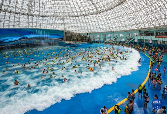7月8日,游客在安徽省芜湖市南陵县大浦乡村世界的海啸馆戏水游玩。