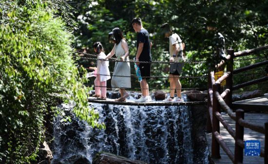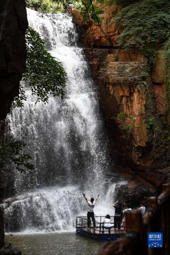 7月9日,游客在新密市伏羲山大峡谷内游玩。
