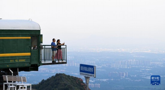 7月9日,游客在新密市伏羲山一处观景台游玩。