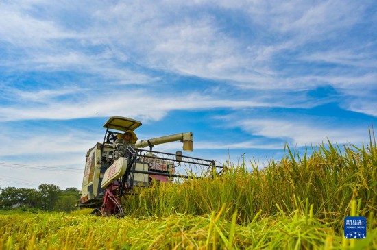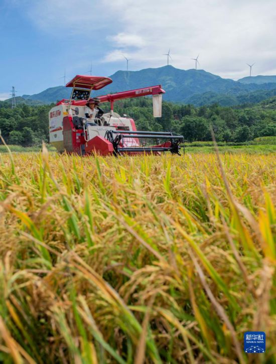 7月11日,在湖南省娄底市双峰县井字镇白碧村,农民驾驶农机收割早稻。