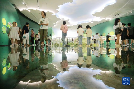 7月12日,小朋友在浙江省科技馆里参观体验。