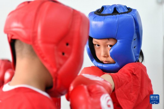 7月12日,小朋友在山东省烟台市福山区一家搏击训练馆进行搏击训练。