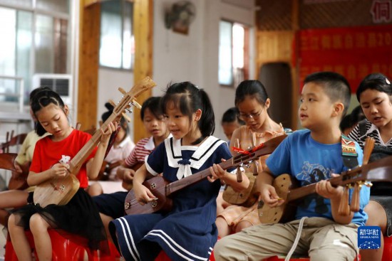 7月12日,在广西三江侗族自治县文化馆,孩子们在弹唱琵琶歌。