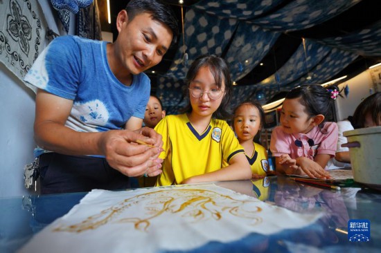 7月12日,在贵州省丹寨县万达小镇一家苗族蜡染非遗体验馆,小朋友在非遗传承人的指导下画蜡画。