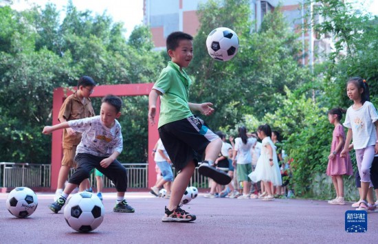 7月12日,孩子们在重庆市北碚区青少年活动中心踢足球。
