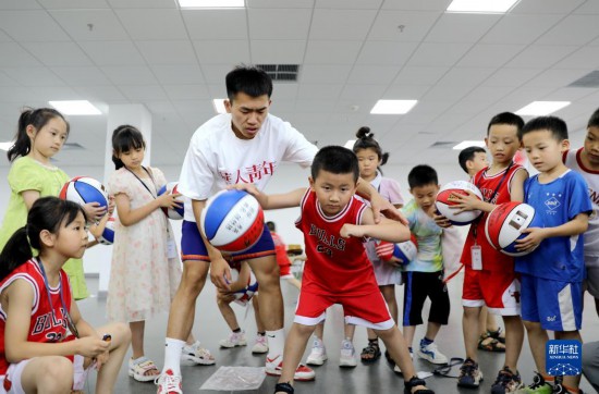 7月11日,在河南省济源市,孩子们在老师的指导下练习篮球。