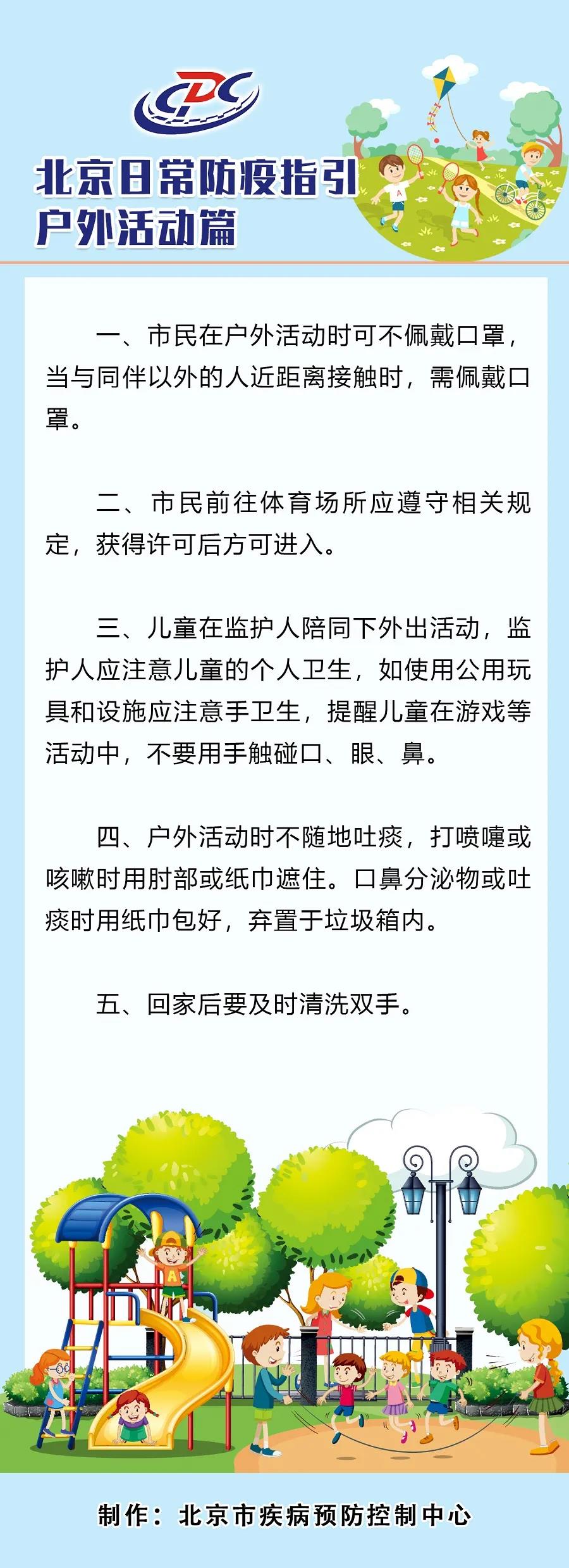 中新网8月20日电 北京市疾病预防控制中心20日在官方微信公众号发布《北京日常防疫指引——户外活动篇》,其中指出,市民在户外活动时可不佩戴口罩,当与同伴以外的人近距离接触时,需佩戴口罩。