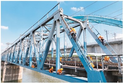 8月3日,中国铁路上海局集团有限公司开展“工电供”多工种联合作业,对陇海铁路上行线邳州运河铁路桥进行检修养护,为暑运安全提供保障。图为中国铁路上海局集团有限公司徐州工务段工作人员对钢梁进行除锈涂漆。