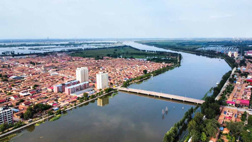 这是8月6日下午无人机拍摄的大清河及堤北村庄(无人机照片)。 新华社记者 孙凡越 摄