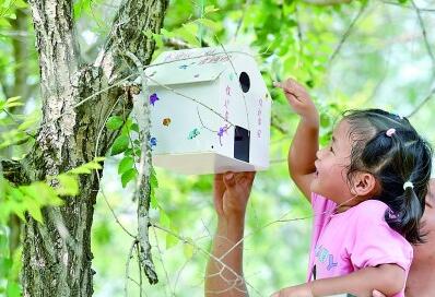 暑假期间,孩子们参加丰富多彩的文体活动,充实假期生活。图为8月13日,在河北省石家庄市举办的“挂巢引鸟”迎接首个全国生态日活动上,家长和小朋友一起悬挂鸟巢。