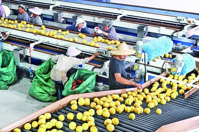 初秋时节,贵州省贵定县德新镇新铺村种植的黄桃迎来收获季,村民忙着采摘、分拣、包装,供应市场。近年来,贵定县以“公司+合作社+农户”模式,打造黄桃种植基地,通过产业增收分红、基地务工薪酬等渠道助农增收。图为8月17日,村民在新铺村黄桃种植基地的车间分拣黄桃。新华社记者 杨文斌摄