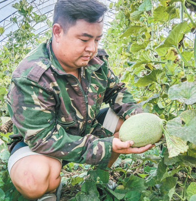 永旺家庭农场负责人楚济旺查看哈密瓜成熟度。 |