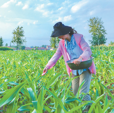 记者在玉米地里撒肥。 |
