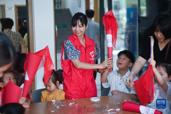 8月24日,在湖州市龙泉街道白鱼潭社区新时代文明实践站,党员志愿者教孩子们制作手工火炬。制作完成后,孩子们共同参与趣味火炬传递活动。