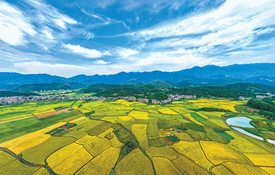 图为8月24日,庙前镇中稻陆续成熟,晚稻长势旺盛,蓝天白云下,广袤田野黄绿相间,与青山绿水、村庄民居相互映衬,构成一幅丰收在望的壮丽田园画卷。