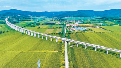 8月29日,在黑龙江省双鸭山市集贤县境内,飞驰的高铁列车行驶在乡村田园间,与绿色的稻田相映成趣,构成一幅美丽画卷。