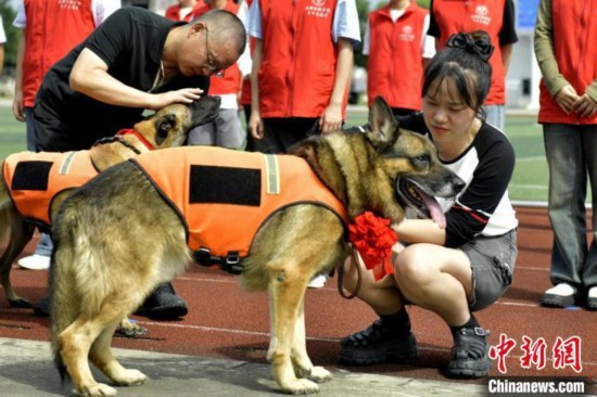 训导员为退役搜救犬戴上大红花并撤下消防搜救犬标识。中新网记者 刘忠俊 摄