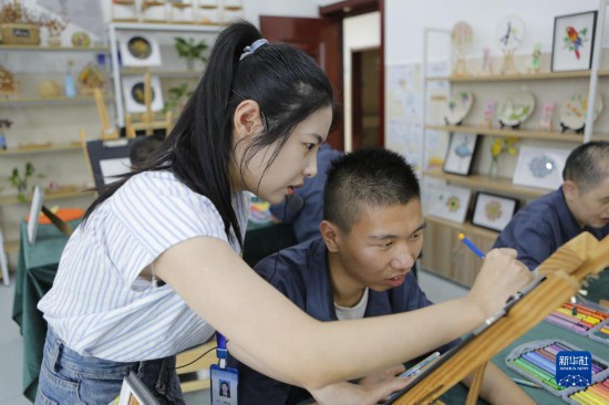 8月30日,在盐城市残疾人托养中心作训室,老师指导学员进行绘画训练。