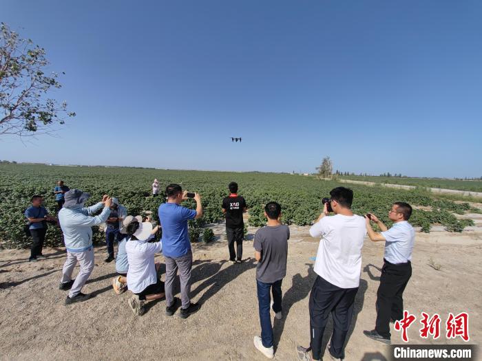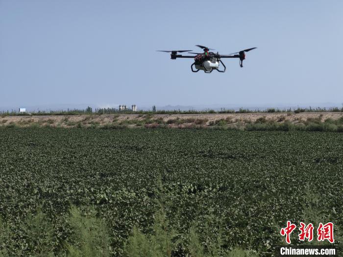 无人机低空飞行巡检棉田。中新网记者 王小军 摄