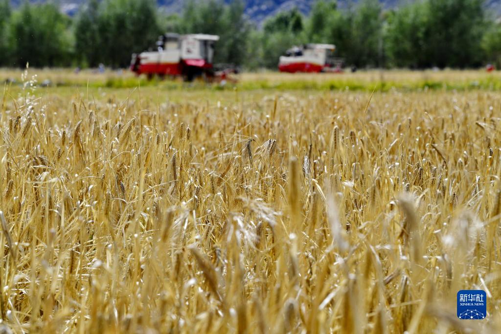 近日,西藏拉萨市曲水县青稞成熟,人们忙着收割青稞,感受丰收的喜悦。