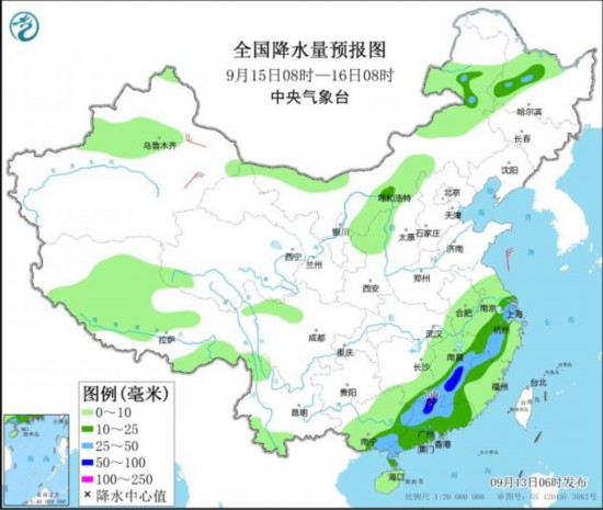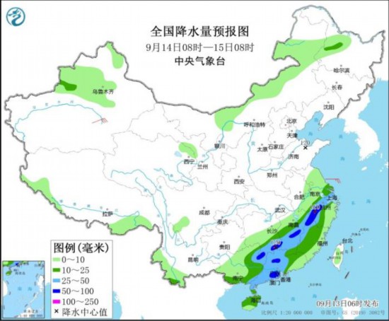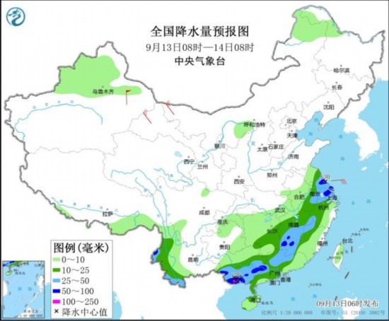 全国降水量预报图(9月13日08时-14日08时)