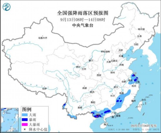 全国强降雨落区预报图(9月13日08时至14日08时)
