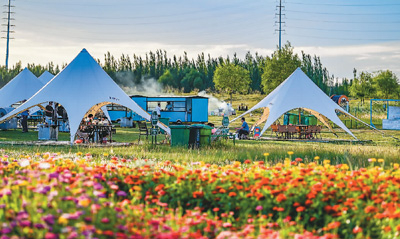 内蒙古自治区鄂尔多斯市伊金霍洛旗依托独特的草原景色和气候优势,打造蜜水畔、红海子、温沙水湾、苏泊罕大草原等多个草原露营旅游新业态,不断延伸旅游景区产业链,持续解锁“露营+”潮玩新体验,吸引游客前来观光旅游。图为伊金霍洛旗蜜水畔草原露营地景色。