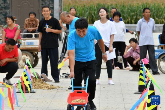 当日,河北省沧州市肃宁县师素镇举办农民趣味运动会,人们通过参与运花生、贴辣椒、豆类分拣等趣味运动项目,庆祝丰收。