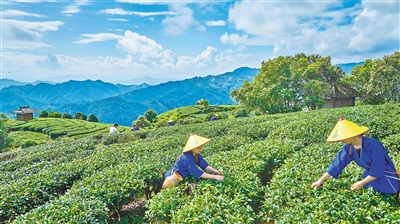 图为日前,布央村的采茶姑娘正在仙人山茶园采摘秋茶。