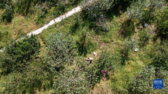 威宁彝族回族苗族自治县雪山镇谢家村村民在采收苹果(9月20日摄,无人机照片)。